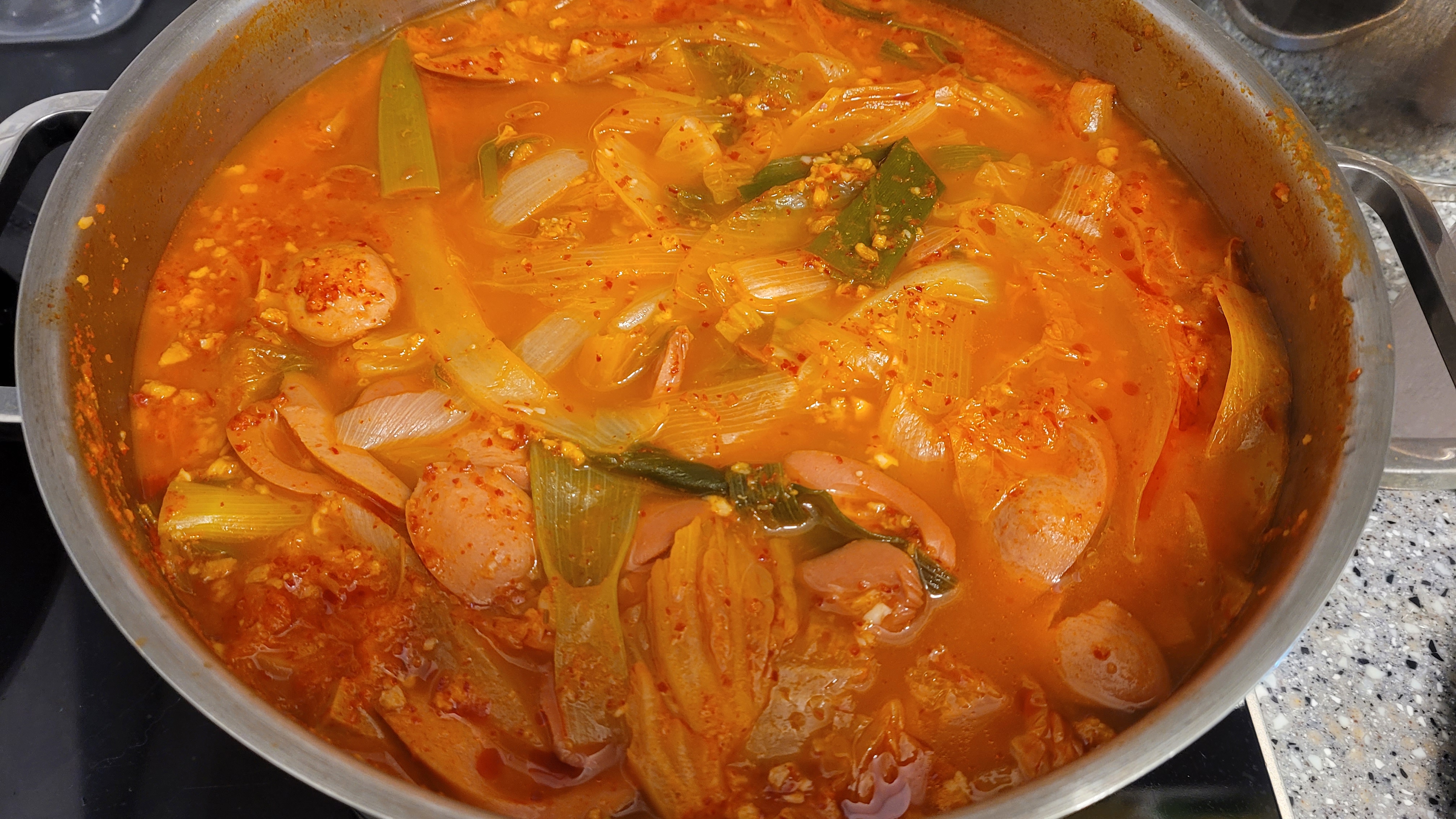 아버지 왈: "육수 한 번에 다 넣으면 맛이 퍼져. 처음엔 자작하게, 나중에 국물 추가하는 거야."