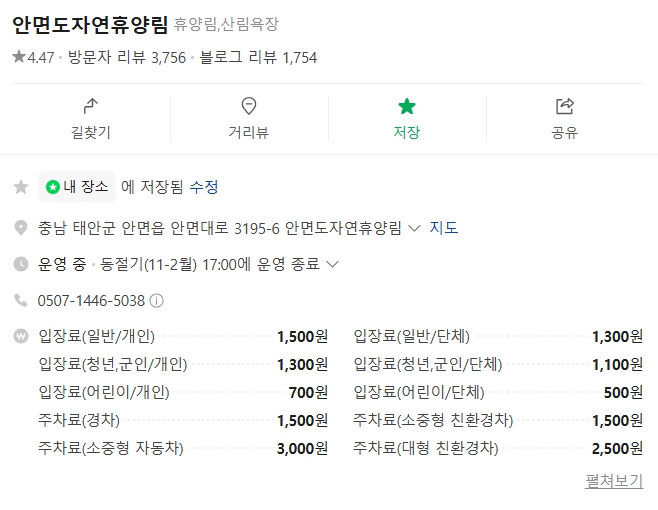 1. 안면도 자연휴양림 입장료 및 이용 요금