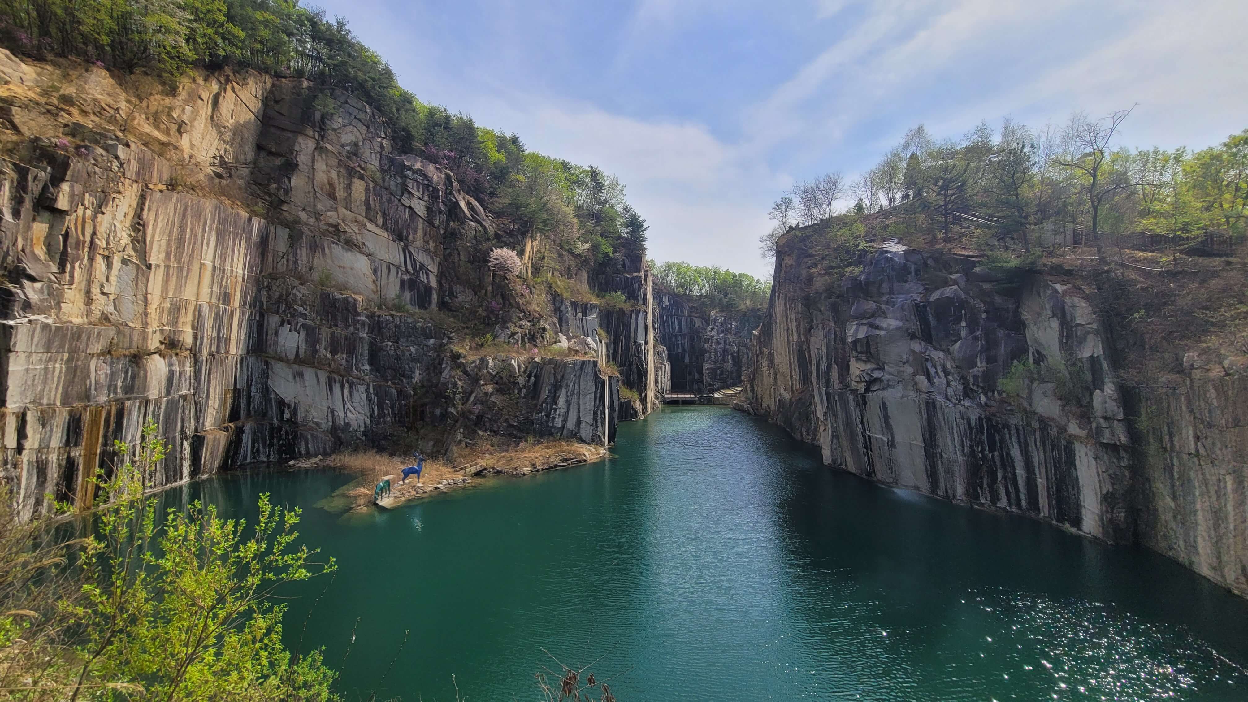 모노레일에서 내려 가장 먼저 향한 곳은 천주호였습니다. 천주호는 과거 폐채석장이었던 곳을 빗물과 샘물로 채워 만든 인공호수입니다. 폐채석장의 거칠고 황량한 모습은 온데간데없고, 푸른 물과 깎아지른 듯한 절벽이 어우러져 절경을 이루고 있었습니다. 천주호의 수심은 무려 25m나 된다고 하는데, 맑고 투명한 물속을 들여다보고 있으면 마치 심연으로 빨려 들어가는 듯한 느낌을 받았습니다. 호수 주변으로는 산책로가 조성되어 있어 천천히 걸으며 아름다운 풍경을 감상할 수 있습니다. 특히 벚꽃과 어우러진 천주호의 모습은 더욱 아름다웠고, 폐채석장의 거친 매력과 벚꽃의 부드러움이 대조를 이루며 독특한 분위기를 연출했습니다.
